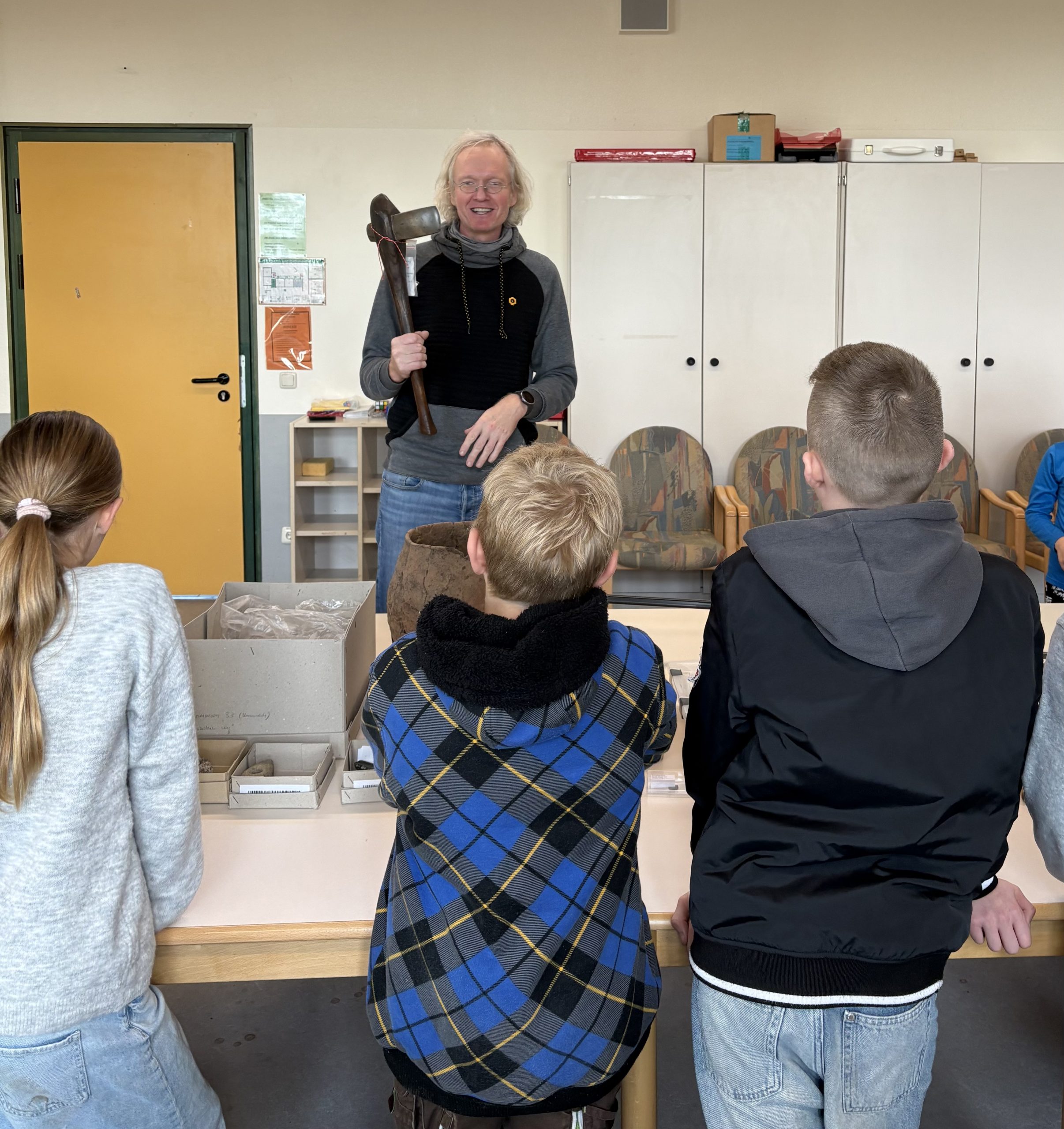„Das ist ja richtig alt!“ – Da waren sich die Schülerinnen und Schüler der drei 5. Klassen einig, als sie die Funde aus der Stein-, Bronze- und Eisenzeit aus dem Landkreis Gifhorn ausgebreitet auf dem Tisch sahen. Für die Schülerinnen und Schüler gab es einiges zu bestaunen und anzufassen. Darunter auch Holz aus dem 14. Jahrhundert, das einstmals zu einem Brunnen gehörte, der auf dem Gelände des heutigen Gifhorner Schlosses stand. Den Geruchstest konnte das über 700 Jahre alt Holz allerdings nicht mehr standhalten.